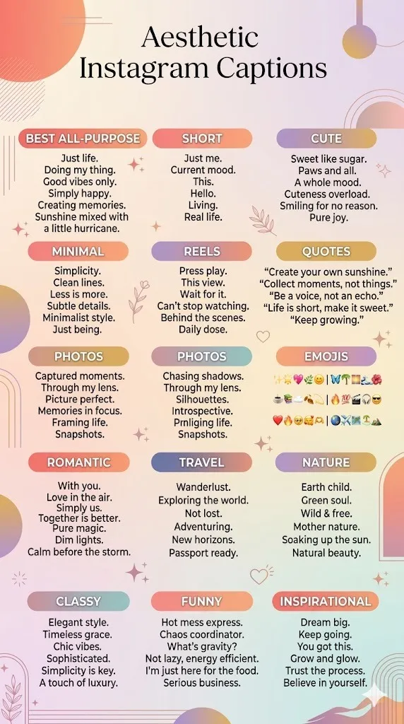 Aesthetic captions work best when they feel natural. They do not need to be complicated. In fact, the strongest ones are often simple, visual, and emotionally clear. A short line can feel elegant. A poetic line can feel memorable. A funny line can make the post more human. The point is to match the caption to the moment so your content feels cohesive from image to text.